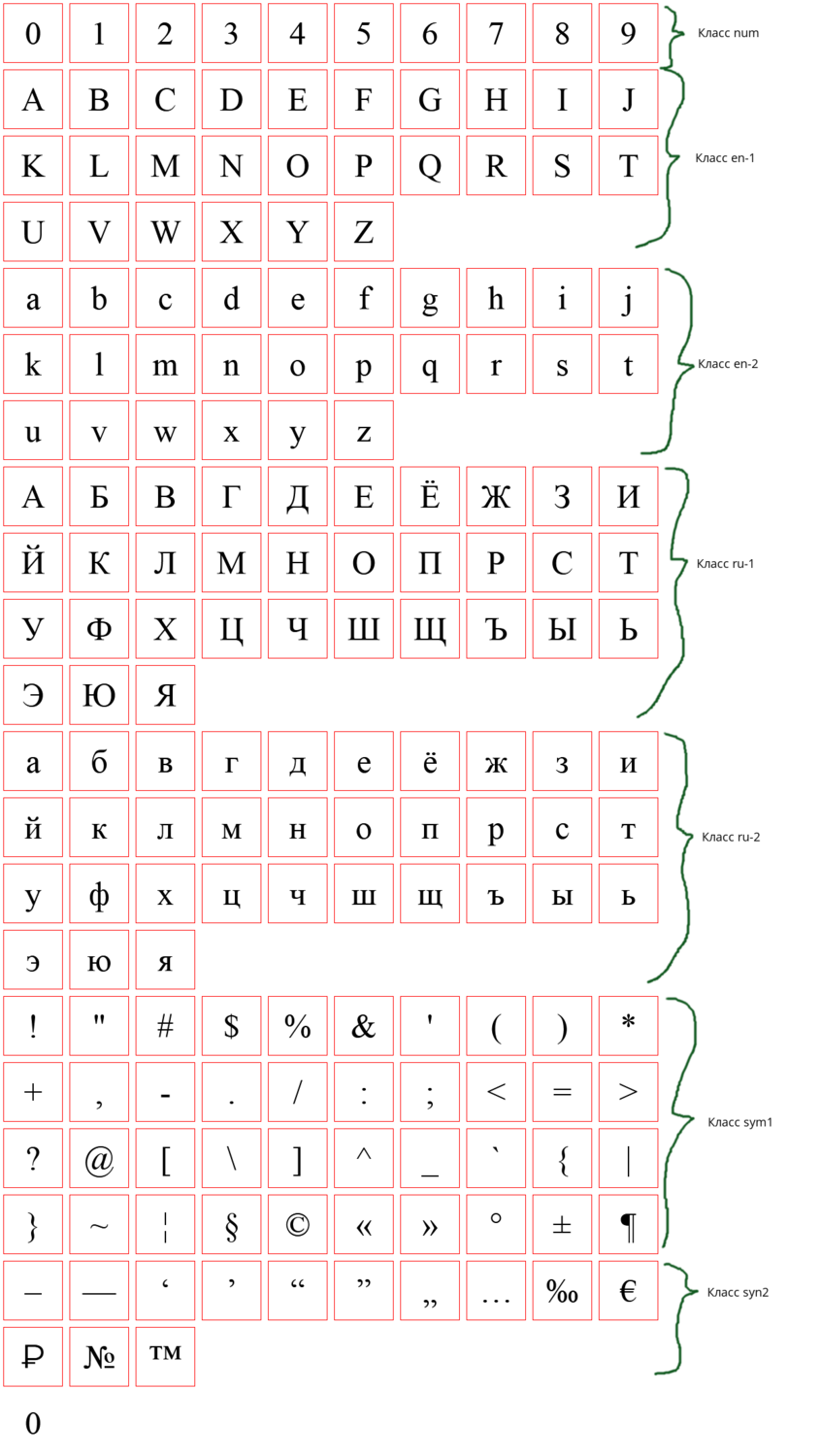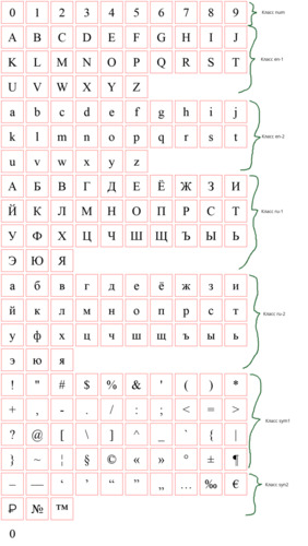 Наборы могут содержать символы следующих классов: